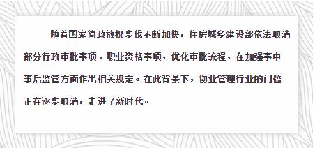 资质取消落到实处。物业服务企业资质核定成为历史并非一蹴而就,而是行业门槛逐步放开过程中的一种必然。从物业管理师资格考试取消、企业二级及以下资质取消核定,到一级资质取消核定,物业管理行业将真正步入无门槛的直面竞争时代,给更多的企业和个人带来机遇。